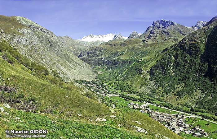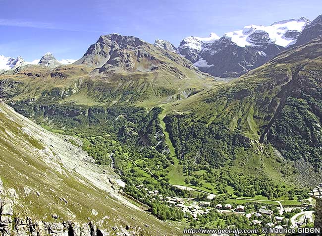 La vallée de l'Arc et les villages de Bonneval-sur-Arc vus de l'est, depuis le chemin de Bonneval aux Évettes.