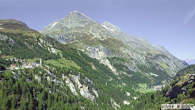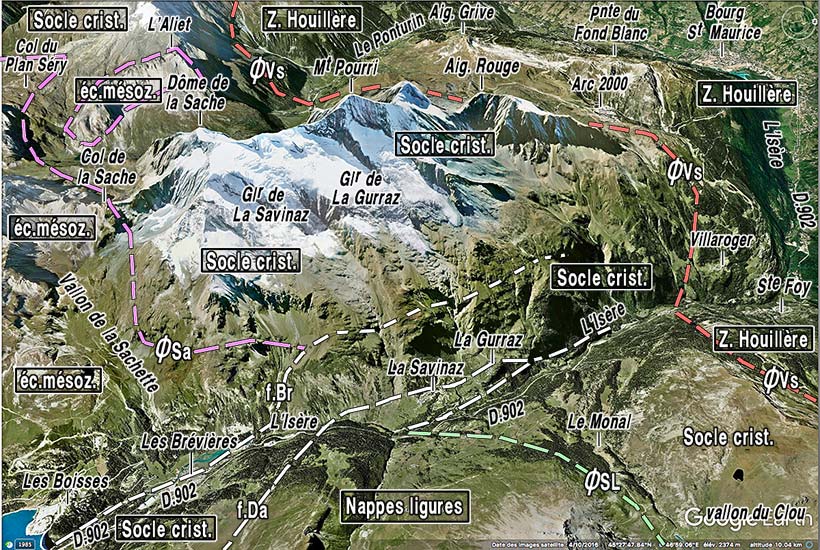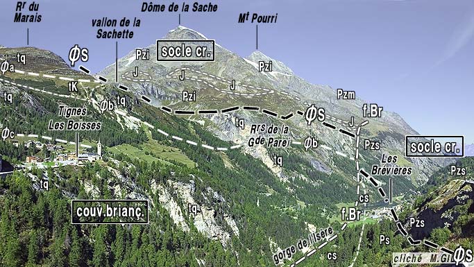 du Mont Pourri n'affleure en effet que beaucoup plus haut et repose sur les quartzites des Boisses par l'intermédiaire du chevauchement de la Sache. Ce dernier suit