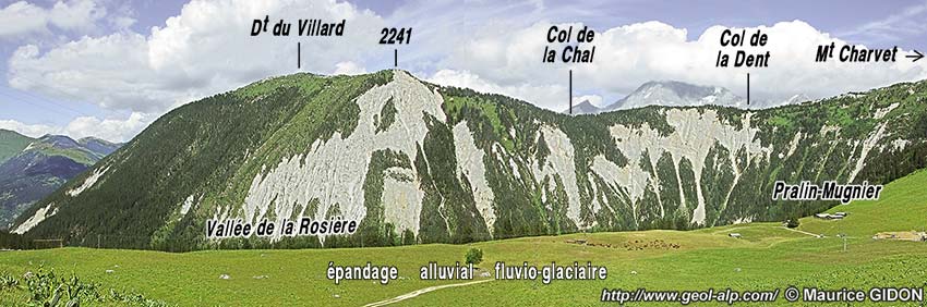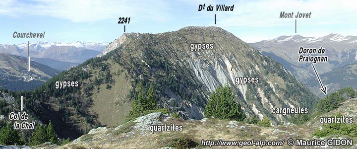Mais à l'est du sommet, peu en aval du Planay, l'entaille de la vallée du Doron de Pralognan montre la structure du soubassement de la Dent du Villard. Les affleurements de gypses et cargneules s'y réduisent fortement entre les puissants épaulements de quartzites du Rocher de Villeneuve (qui appartiennent à la Vanoise orientale) et le carbonifère de la marge orientale de la zone houillère (qui percent. Entre les deux ces affleurements gypses s'enfoncent en ne formant plus qu'une bande étroite à fort pendage est, le long de laquelle l'épaisseur des gypses se réduit vers le bas : on a là une disposition en pédoncule qui évoque remarquablement l'expulsion et l'étalement vers l'ouest du contenu d'un graben.