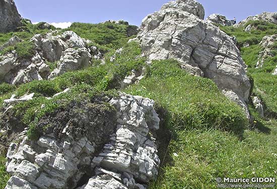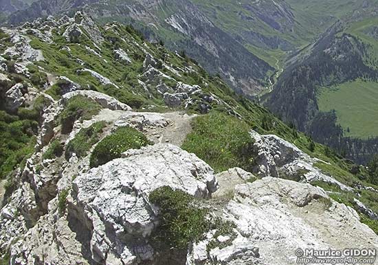 Au sommet même de la Dent du Villard : à gauche : affleurements de gypse lité, sculptés en pitons par la dissolution ; à droite : le sentier de crête peine à trouver un itinéraire entre les trous perçant les couches de gypse.