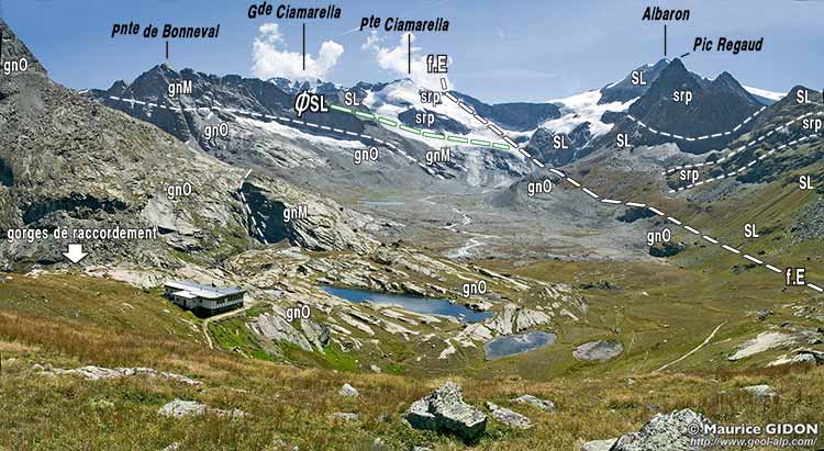 En fait ces deux ensembles sont juxtaposés, en marge ouest du cirque, par une faille N-S, la faille du col des Évettes, dont le compartiment occidental est abaissé. De ce fait la surface structurale du socle, remontée par la faille, n'est guère observable que sur le flanc ouest de la bosse portant le refuge (Roc des Pareis), où l'érosion à respecté les placages de cargneules qui enduisent la surface des gneiss (ailleurs cette surface est trop surélevée et se trouvait plus haut que les crêtes que l'érosion a sculpté dans le socle cristallin.