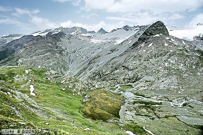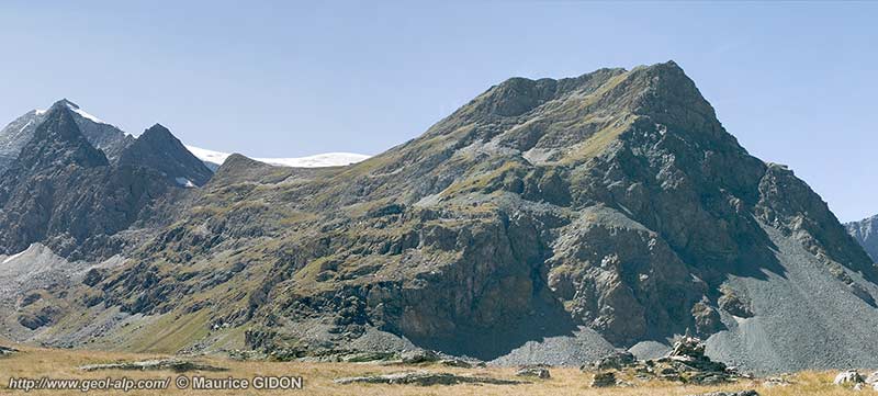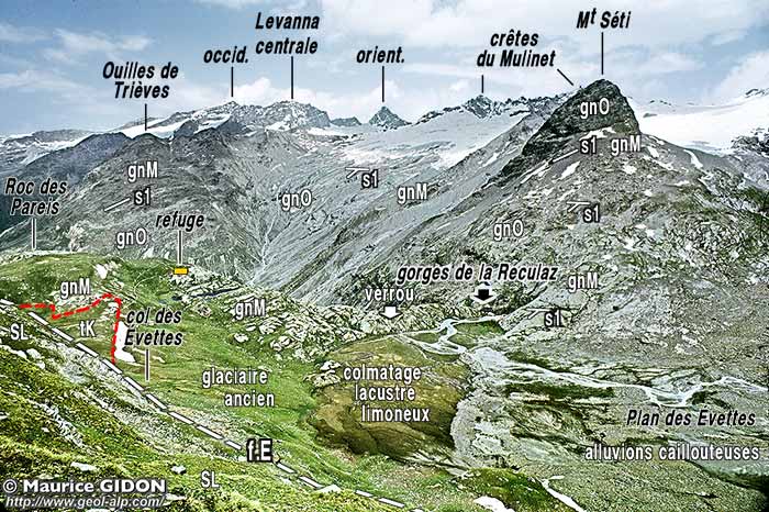 | Le sentier d'accès au refuge des Évettes reste tout du long dans le socle cristallin. Depuis le parking du hameau de l'Écot, il s'élève d'abord dans les gneiss œillés puis rentre dans les gneiss fins à partir du milieu de sa traversée vers l'ouest. C'est lorsqu'il atteint à peu près le toit de ces affleurements du socle qu'il fait le grand lacet qui le ramène vers l'est. Il suit alors, jusqu'au delà du Plan des Roches, le pied des pentes de schistes lustrés qui forment le soubassement de l'Ouille du Midi. Un nouveau lacet le ramène vers l'ouest en lui faisant traverser la barre rocheuse ocreuse des marbres jurassiques (indiquée en cargneules, par erreur, sur la carte au 1/50.000°), avant de faire un coude pour suivre le vallon N-S qui mène au col des Évettes (où il reste dans les schistes noirs très micacés et friables qui couronnent cette barre). Arrivé aux abords du col le sentier repart vers l'est (vers la gauche) pour gagner le refuge et traverse la faille des Évettes juste avant d'atteindre les affleurements de cargneules qui représentent la semelle tectonique de la nappe de Bonneval : on voit clairement que ces roches forment une sorte d'enduit qui recouvre directement les gneiss clairs formant, au nord du refuge, la butte des Pareis. |