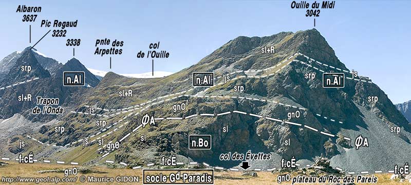 Le versant Évettes de cette crête est formé jusqu'à son pied par le matériel charrié de la nappe de l'Albaron, car il est abaissé par rapport au socle cristallin, surélevé dans le cirque par la faille du col des Évettes. À l'ouest de cette faille le matériel de la nappe de Bonneval affleure cependant tout au nord, dans le pied des escarpements de l'Ouille du Midi et surtout dans les pentes de son versant septentrional, dans les pentes que traverse d'ouest en est le sentier qui monte depuis l'Écot ; à l'est de la faille (refuge des Évettes et Roc des Pareis) il a été enlevé par l'érosion qui a mis à nu le socle cristallin du Grand Paradis.