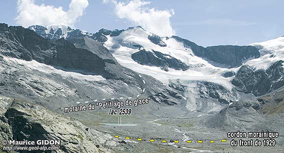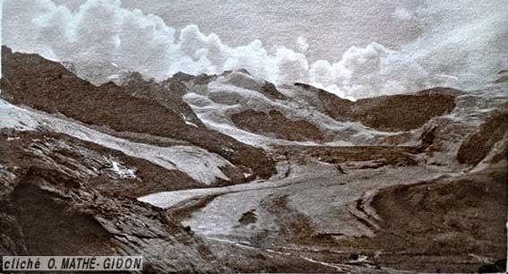 Il faut souligner que cette langue du glacier des Évettes, qui remplissait le cirque au maximum de son extension, s'avançait encore jusqu'à 1 km de l'actuel refuge en 1920-1930 (voir clichés ci-dessus)