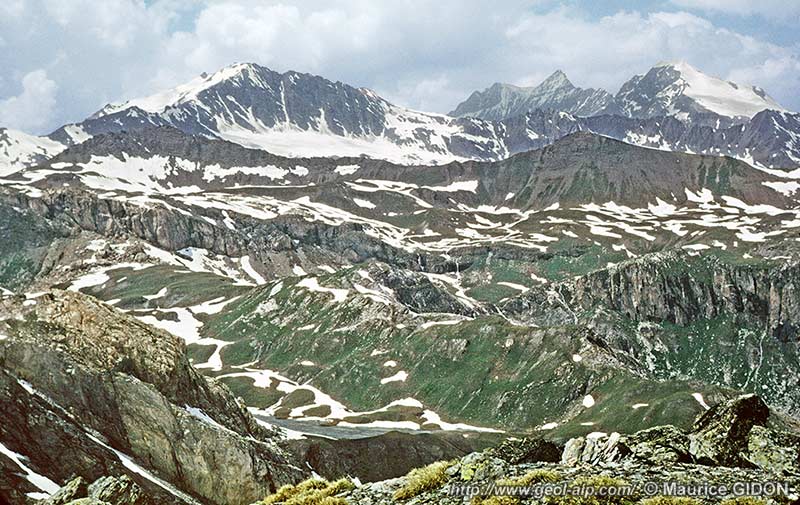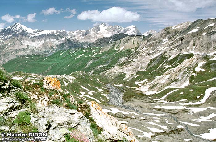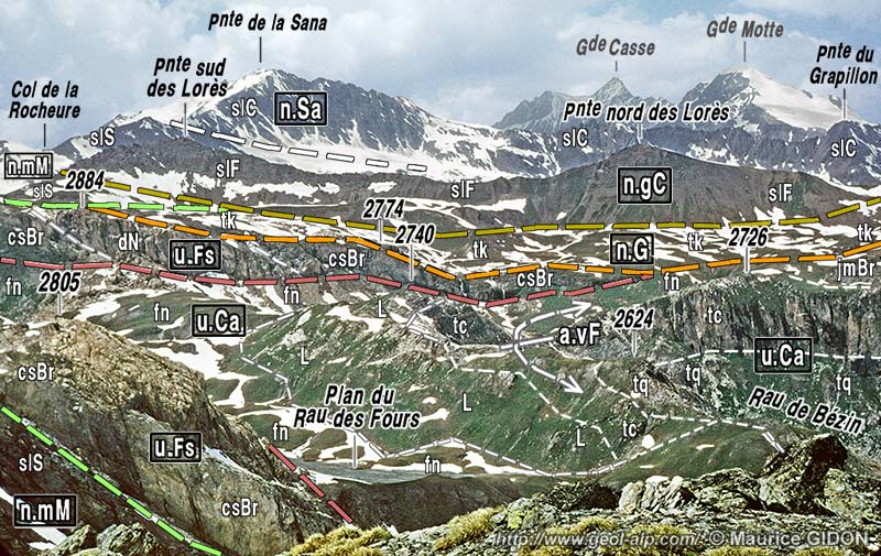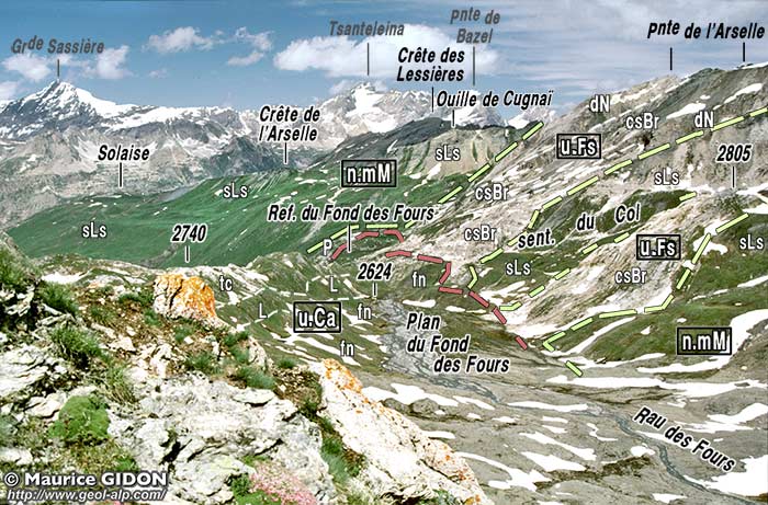 ![]() Le Vallon des Fours vus du sud (d'amont), depuis le rebord oriental du plateau des Lacs des Lorès (laquet 2857) n.mM = nappe de Méan Martin ; u.Fs = unité des Fours (nappe de la Tsanteleina) ; "P" = micaschistes permiens ; u.Ca = unité briançonnaise de la Calabourdane. Les rochers d'avant plan sont des brèches à gros blocs de l'unité des Fours |