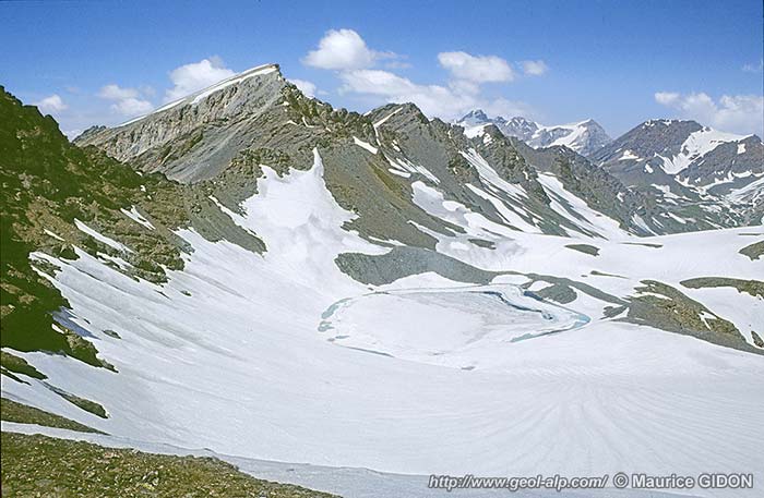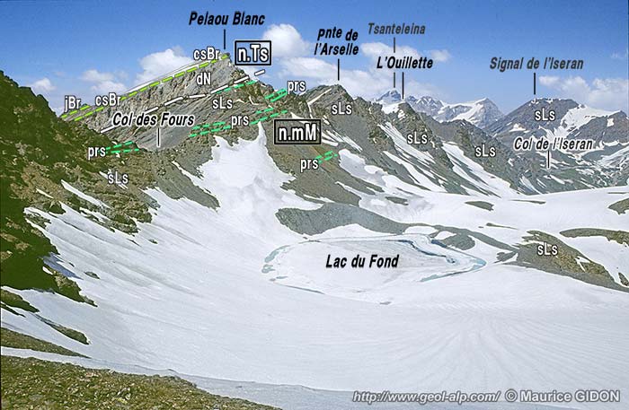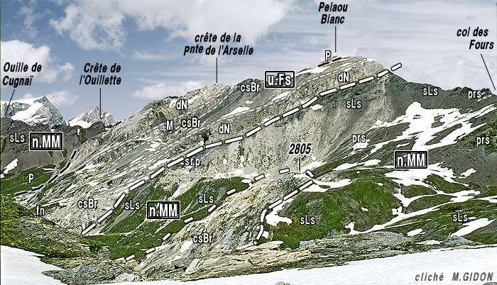 ![]() Les montagnes de rive droite (orientale) du Vallon des Fours vues du sud, depuis le rebord du plateau des Lacs des Lorès. Au Pelaou Blanc la nappe de Méan Martin (n.MM) est recouverte apparemment en rétro-charriage* par l'unité des Fours (u.Fs), dont le matériel est reployé en un synclinal couché (sa constitution stratigraphique porte à le rapporter au même ensemble paléogéographique que la nappe de la Tsanteleina) ; "P" = micaschistes permiens (qui lui sont associés ?). |