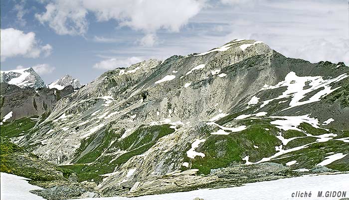 En fait, au sud du vallon du Pisset on observe sur le terrain comme sur la carte du BRGM que ce flysch noir, caractéristique de l'unité de la Calabourdane, repose en outre sur les carbonates triasiques et jurassiques peu épais de la Tête et du vallon des Fours. De plus il le fait d'une façon qui rend plus plausible un contact stratigraphique que celui, tectonique, indiqué sur la carte. Par contre il n'est pas évident que ce flysch noir ait des rapports stratigraphiques avec les micaschistes permiens qui affleurent dans le vallon entre le Manchet et la cabane pastorale. Ces derniers sont, au contraire, plutôt en rapport avec les dolomies noriennes et avec les brèches néocrétacées du Pelaou Blanc. En effet dans les pentes en amont du Chalet Pastoral, les affleurements les plus septentrionaux de ces dernières se développent dans le prolongement de ceux de micaschistes du Manchet. En outre au sommet même du Pelaou Blanc ces brèches supportent un petit affleurement de ces micaschistes. Enfin la grosse bosse des quartzites de la Tête des Fours (voir le cliché en haut de page) doit logiquement être séparée des unités de Val-d'Isère (comme celle du Charvet ou celle de Bellevarde) car elle est pratiquement dépourvue de Trias moyen carbonaté. En définitive il faut la rattacher à l'unité de la Calabourdane car ses quartzites sont le cœur d'un anticlinal couché dont le flanc inverse se poursuit vers le nord en constituant le talus de pied des escarpements du Rocher du Charvet, c'est-à-dire l'unité de la Calabourdane à proprement parler. Ces remarques justifient certains désaccords entre les attributions structurales adoptées ici et celles de diverses autres publications. |