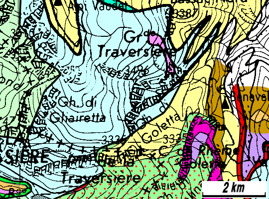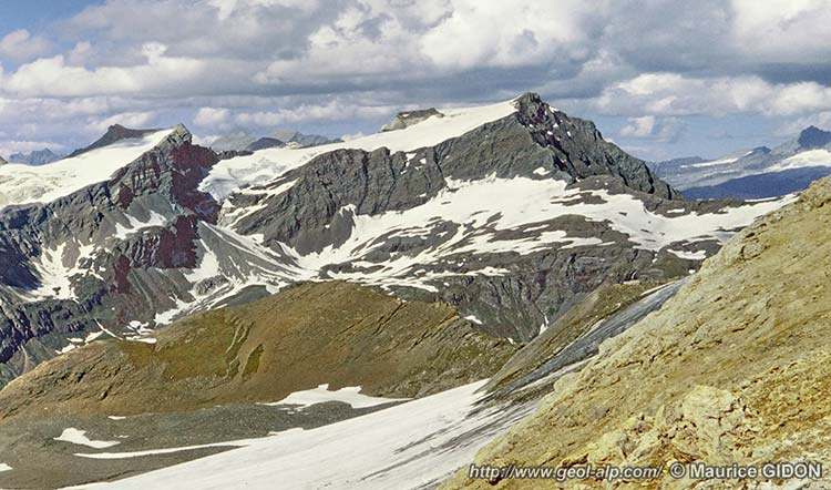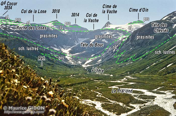 Dans les anciennes publications les deux unités du Malpasset et du Prariond étaient groupées sous le nom de "faisceau du Prariond" et considérées comme un éventail de plis enveloppé par les schistes lustrés et s'épanouissant du NE vers le SW. En fait, dans les pentes qui s'élèvent en rive droite au dessus des gorges du Malpasset (voir la page "Aiguille Pers"), l'unité du Malpasset a une structure synclinale et c'est apparemment elle qui s'ouvre en rive gauche en hébergeant en son cœur la grosse klippe du signal de l'Iseran (nappe de Méan Martin). Les dolomies triasiques du flanc méridional de ce synclinal de l'Iseran suivent le bord de cette klippe en formant notamment la zone de dalles structurales des Plates du Vallonnet qui se dirige vers le col Pers mais sans l'atteindre. Elle s'y poursuit cependant par la bande de gypses et cargneules qui passe en contrebas est du col de l'Iseran. Parallèlement à ce flanc sud du synclinal couché de l'Iseran passe plus à l'est une bande de schistes lustrés qui reposent sur des dolomies noriennes dotées d'une forte semelle de cargneules : on peut l'appeler unité du Prariond car c'est à peine au dessus du refuge de ce nom qu'elle repose sur l'unité de l'Albaron. Au sud de la gorge du Malpasset (voir la page "Aiguille Pers") elle s'effile à son tour mais semble se prolonger, à l'est du Col Pers, que par les cargneules qui franchissent la crête entre la Pointe Pers (3317) et l'Aiguille Pers : elle apparaît donc comme la terminaison septentrionale de l'unité du Charbonnel (voir la page "Iseran est"). |