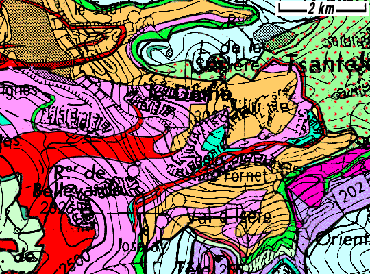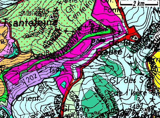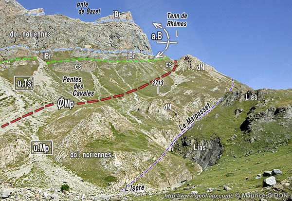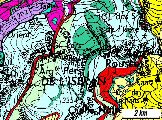 Il faut observer que la coupe du thalweg de l'Isère est orientée sensiblement W-E alors que les bandes de terrains qu'elle traverse ont une orientation SW-NE : elle n'est donc pas orthogonale aux structures. C'est pourquoi l'entaille de ses flancs donne, du fait de leurs inclinaisons opposées, une géométrie d'intersection avec les couches qui est différente d'un versant à l'autre. |