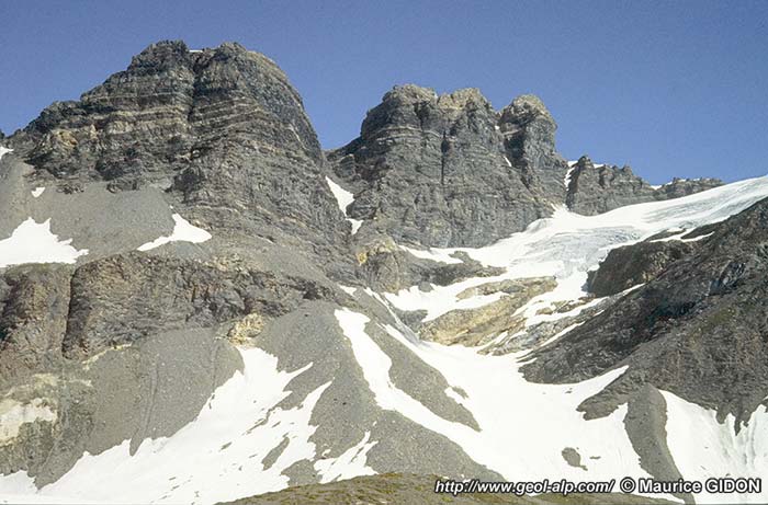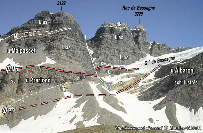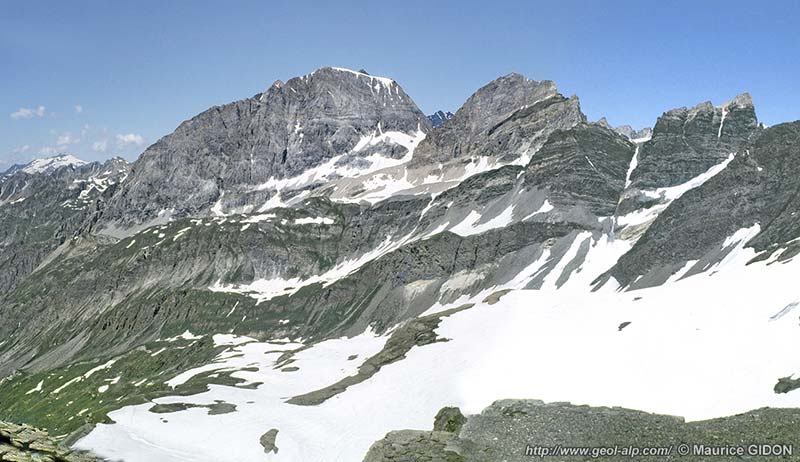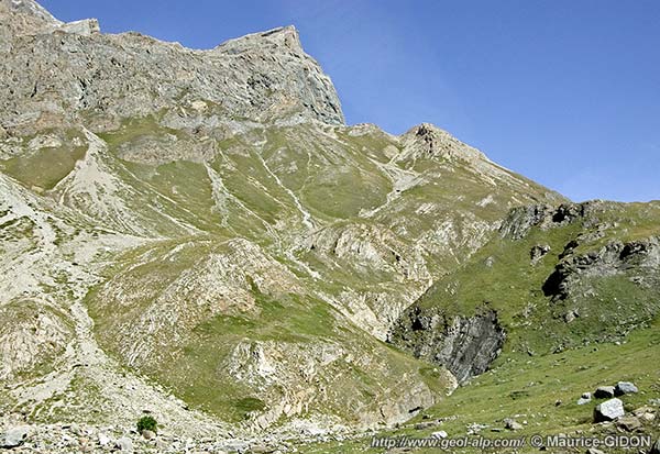 Ce mille-feuilles tectonique repose enfin sur les schistes lustrés (à caractère ligure) de la nappe de l'Albaron. Ils affleurent depuis le refuge du Prariond en s'élevant dans le versant jusqu'à former la crête frontière à la Pointe de la Galise.
