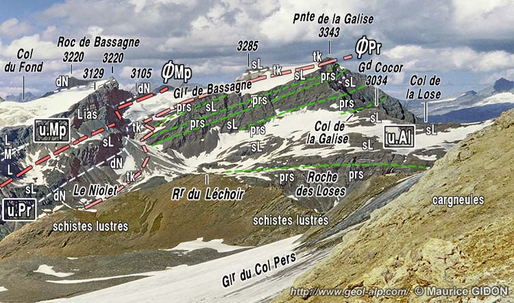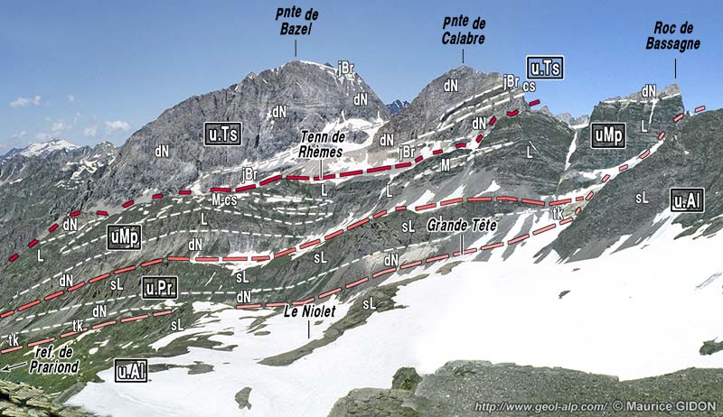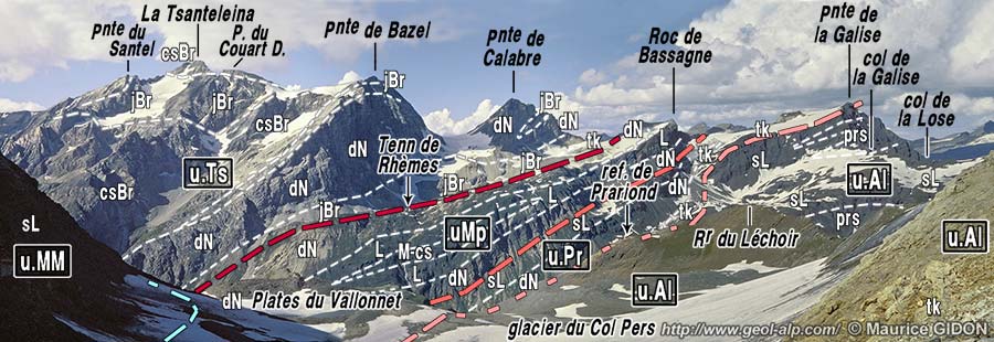 ![]() Les crêtes du versant septentrional du cirque du Prariond, vues de l'est depuis le sommet du Grand Cocor (entre col de la Galise et col de la Lose, sur la frontière franco-italienne). u.Ts = unité de la Tsanteleina ; u.Mp = unité du Malpasset ; u.Pr = unité du Prarion ; u.Al = unité de l'Albaron et de l'Aiguille Pers. Le sommet de la Pointe de Calabre est formé de Norien en succession renversée qui repose sur une bande des schistes noirs, sans doute jurassiques, lesquels recouvrent des brèches à ciment de marbres chloriteux néocrétacés. Le fait que ces dernières couches reposent de nouveau sur du Norien résulte sans doute d'un chevauchement mineur, maintenant renversé. voir les détails de la falaise de la Pointe de Bazel à la page "Tsanteleina". |