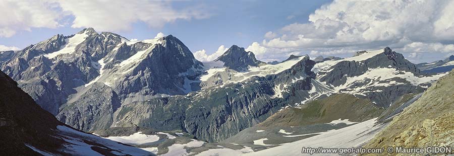 Puis ils forment, plus au côté sud-est, toute la partie la plus rentrante du cirque des sources de l'Isère, en passant par le Col et la Cime de la Vache, jusqu'à la Cime d'Oin.