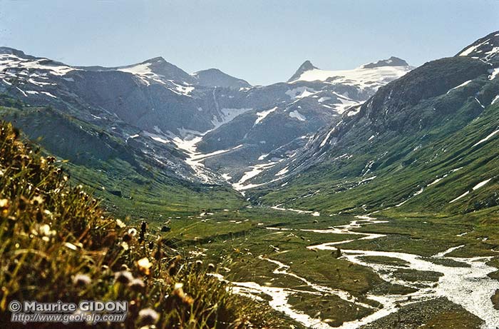 C'est immédiatement à l'est du Pont Saint-Charles (voir la page "Fornet"), entre les montagnes de la Tsanteleina au nord et du Signal de l'Iseran au sud que l'Isère naît à proprement parler, sous l'aspect d'un torrent qui s'échappe du large vallonnement en versant sud duquel se trouvent ses sources (voir la page "Aiguille Pers"). Les torrents de fonte des divers glaciers qui constituent ces dernières se réunissent en effet au plan alluvial dénommé Le Prariond (au pied du refuge portant son nom), avant de s'échapper de cet amphithéâtre montagneux en franchissant le verrou* des gorges du Malpasset.