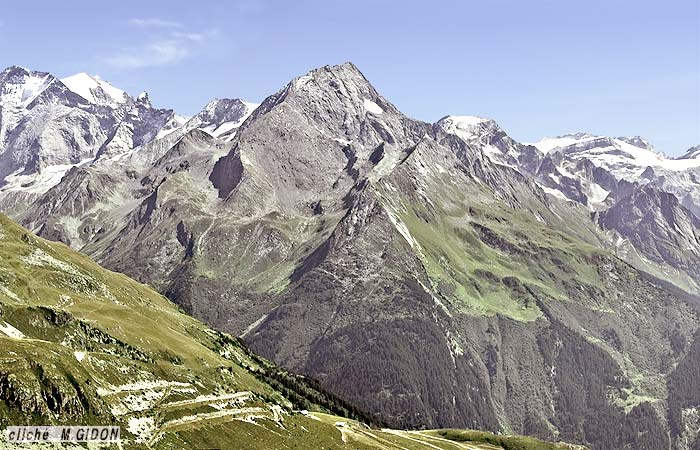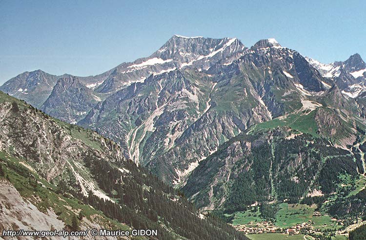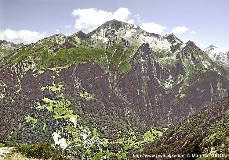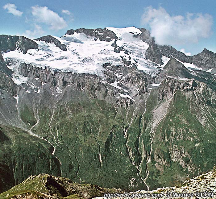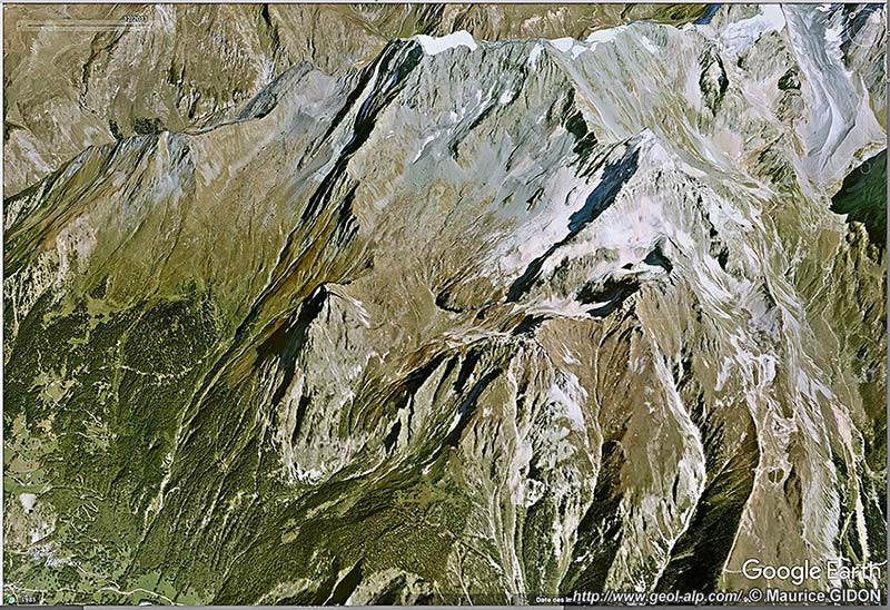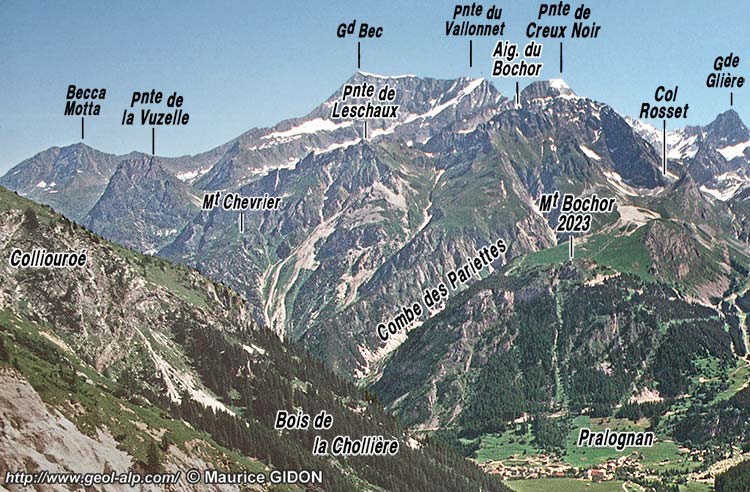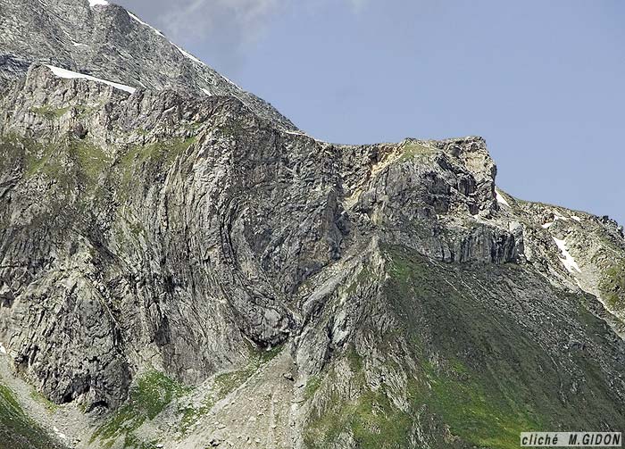 Le versant méridional du Grand Bec vu du sud, depuis les pentes septentrionales du Petit Mont Blanc. Depuis cette altitude de prise de vue les plans successifs de ce versant se superposent, ce qui rend pratiquement impossible la représentation des rapports entre leurs structures. On trouvera un correctif à l'image suivante, dont l'angle de vue est au contraire plongeant vers le nord. La suite de ce paysage vers la droite est représentée et analysée à la page "Bochor". |