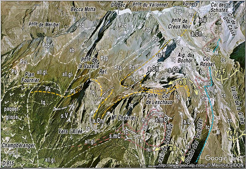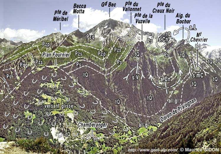 A/ Sur le versant sud-ouest de la montagne la succession se complète par les couches permo-triasiques siliceuses de la Vuzelle puis par les calcaires mésozoïques dans les pentes du Mont Bochor. Toutes ces couches se succèdent en série stratigraphique normale, globalement pentée vers le sud-ouest avec leur base au nord-est et un pendage qui s'accroît du haut vers le bas jusque au renversement.