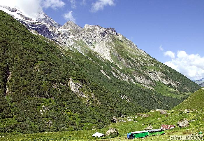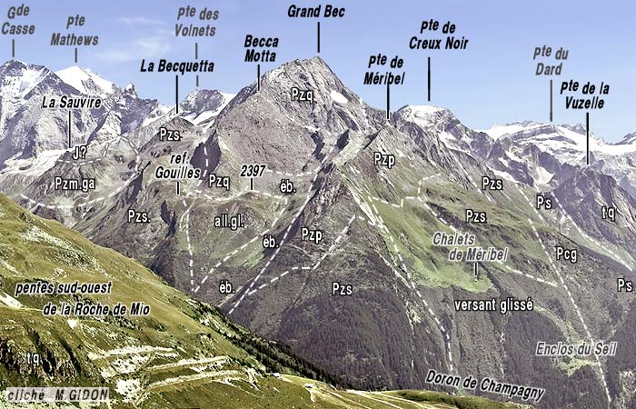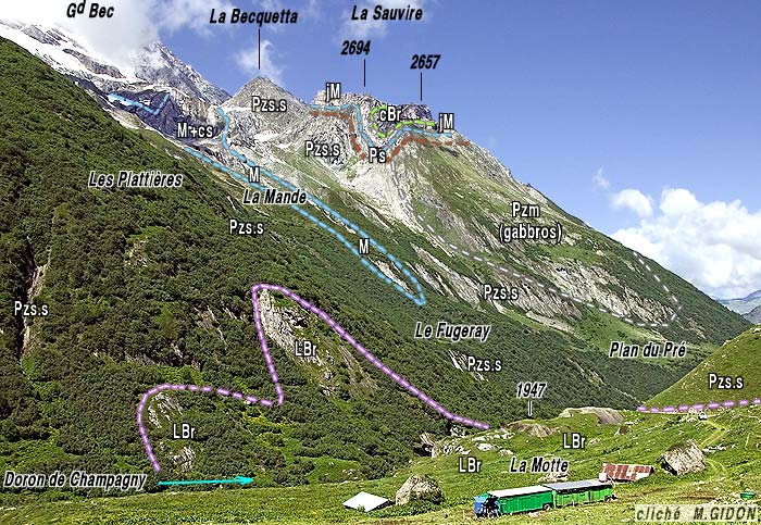 ![]() Le versant sud-oriental du Grand Bec (crête de la Sauvire) vu de l'est, depuis le Grand Chalet de la vallée du Doron de Champagny. LBr = brèches à ciment marbreux (Lias inférieur ?) : cette bande de roches calcaires détermine un petit verrou où les glaciers anciens ont laissé la trace de leur passage sous forme de belles roches moutonnées* ; M = lame de marbres (Malm probable). Voir le cliché précédent pour le détail des affleurements de la Sauvire et la page "Glière" en ce qui concerne les affleurements de La Motte. |