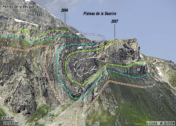 En fait on observe là une situation assez similaire à celle de la bande de mésozoïque du col de la Chiaupe (voir la page "Champagny"). En effet, dans les deux cas, le mésozoïque repose sur du socle renversé (et plus précisément ici sur le coeur, érodé, d'un pli couché). En outre les couches de la butte-témoin de la Sauvire sont ployées en plis couchés déversés vers le nord-est, c'est-à-dire que leur vergence peut être comparée à celle du chevauchement de Mio. Cette situation est paradoxale car elle supposerait l'intervention (très invraisemblable) d'une tectonique capable d'avoir déformé le socle cristallin avant le dépôt des couches mésozoïques. Elle pose un problème qui , semble-t-il, n'a jamais été pris en considération par les auteurs. On en trouvera une tentative d'explication à la page "tectonique de la Vanoise". |