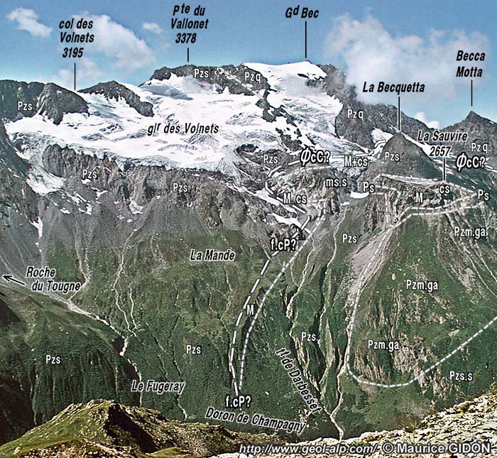 ![]() Le Grand Bec (versant oriental) vu de l'est, depuis la Roche Noire de Vallaisonnay. La couverture mésozoïque transgressive sur le socle cristallin affleure de deux façons différentes : a) sous forme d'une butte-témoin* qui forme le petit plateau suspendu de La Sauvire (voir détails plus loin dans cette page); b) sous forme d'une bande étroite qui traverse selon une oblique très inclinée le ravin de Darbesset, pour aboutir au col entre le Grand Bec et la Becquetta : elle pourrait se prolonger vers le NW en déterminant le vallon des Côtes Vertes qui descend de ce col vers le refuge des Gouilles. f.cP? = prolongement vraisemblable de la faille du Col du Palet (voir la page "Vallaisonnay") ; ØcC? = prolongement méridional hypothétique du chevauchement de La Chiaupe (voir la page "Champagny") |