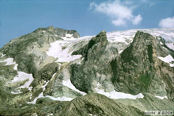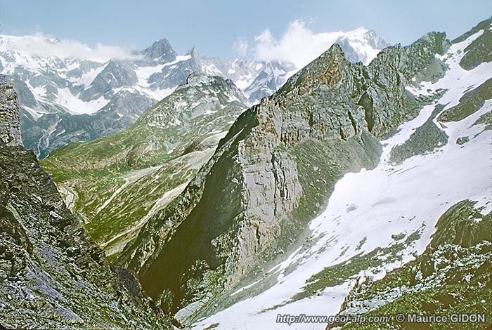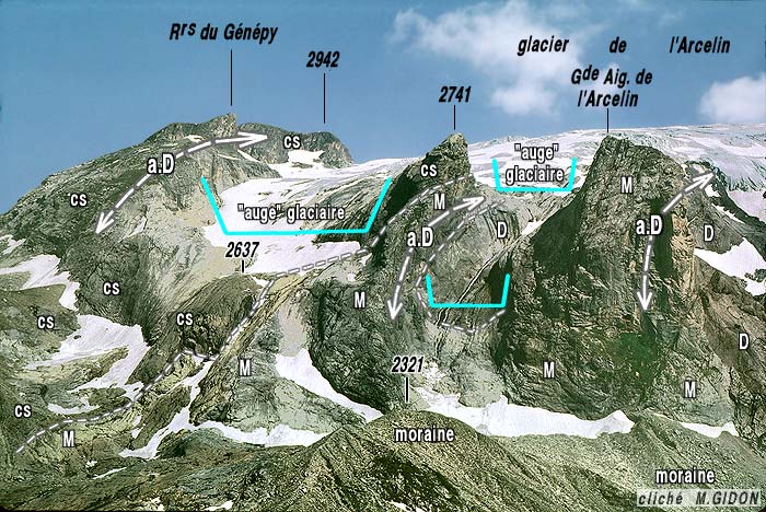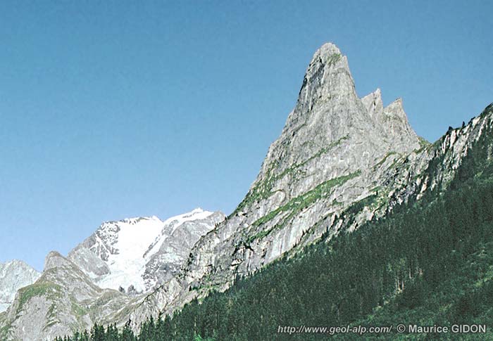 Au sud-ouest des trois auges par lesquelles s'échappaient les langues du Glacier de l'Arcelin, la crête des Aiguilles de l'Arcelin appartient à cette couverture carbonatée. Elle constitue un contrefort triangulaire montant à l'assaut du plateau glaciaire du même nom. Mais cet dalle rocheuse a été percée par l'érosion qui a crevé, dans le cirque du Dard, la couverture siliceuse permo-triasique et y a mis à nu le rouleau dessiné par la surface des micaschistes du socle.