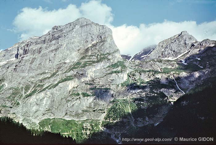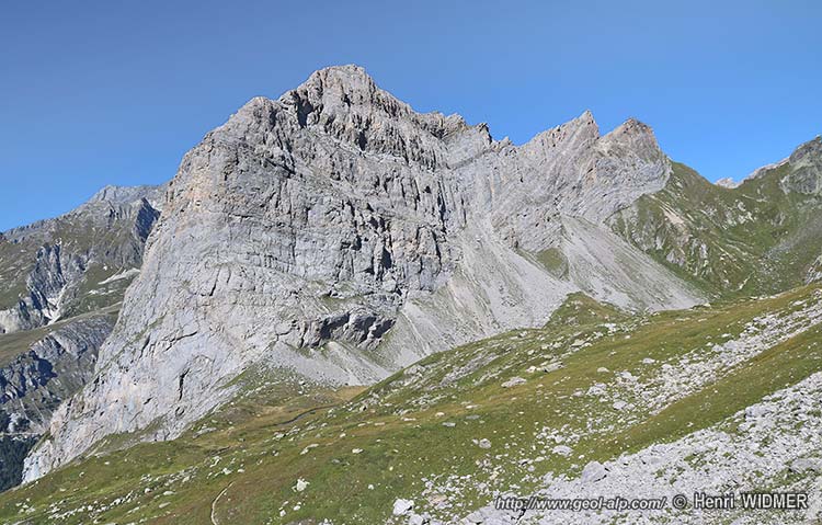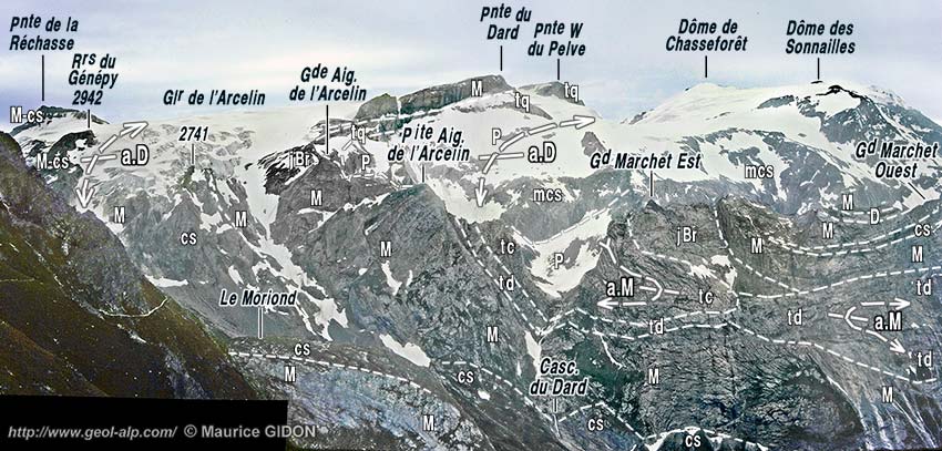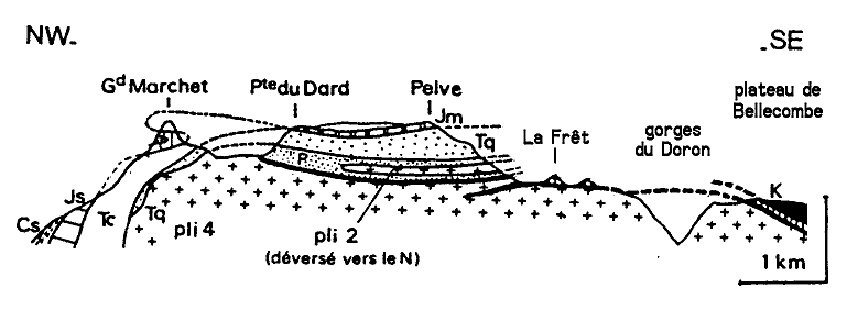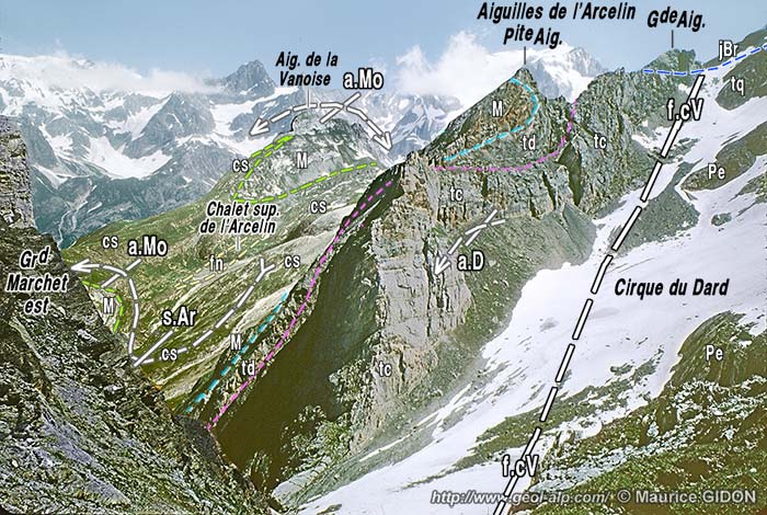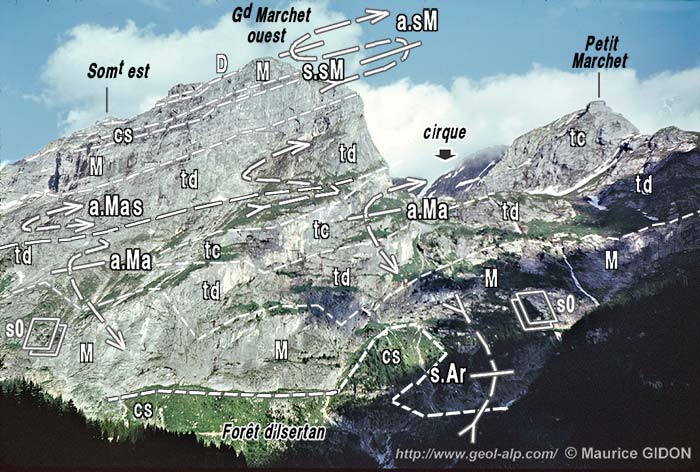 C'est dans ses abrupts méridionaux, qui tombent sur le cirque du Grand Marchet, que l'on analyse le plus clairement cette structure, en dépit d'une orientation oblique aux plis qui donne une vue étirée de leurs charnières. On y distingue une structure stratifiée où les calcaires massifs (essentiellement des marbres blancs du Malm) sont coupés de vires (très abruptes) marquées par un peu de végétation. C'est le résultat d'un reploiement des couches en plis couchés très aplatis, à flancs isoclinaux* (= de même pendage) de la phase "2". Leurs plans axiaux sont inclinés vers le nord-ouest (c'est-à-dire vers la cuvette de Pralognan), selon une disposition qui est due à leur "enroulement" tardif par les plis de la phase "4" et notamment de la charnière anticlinale du Dard et de son repli inférieur, l'anticlinal en genou du pied du Marchet.