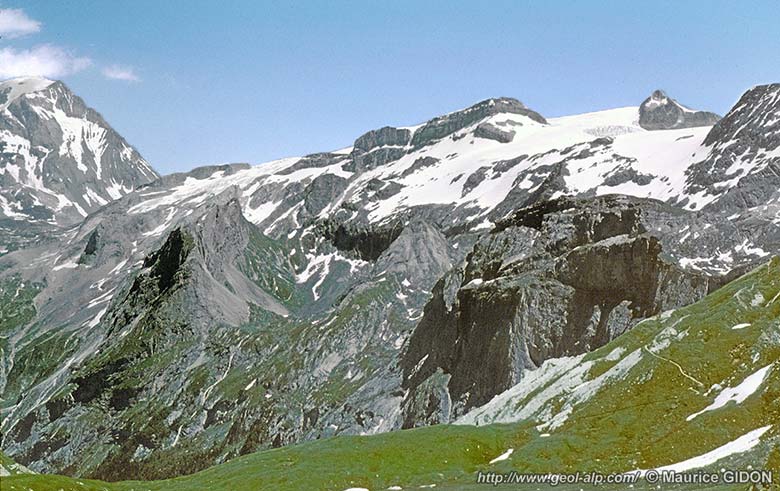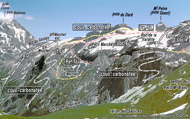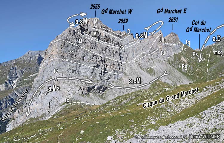 Le Grand Marchet est, quant à lui, un énorme panneau de couverture calcaire qui domine Pralognan par presque un millier de mètres de falaises presque lisses. Cette épaisseur est due à un empilement de replis qu'on parvient à y lire en scrutant la succession des couches.