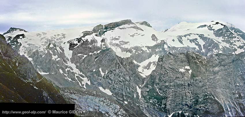 ![]() Coupe des glaciers de la Vanoise au niveau du Pelve, d'après H. Dondey et al (extrait de Debelmas et Desmons, 1997, légèrement retouché). |