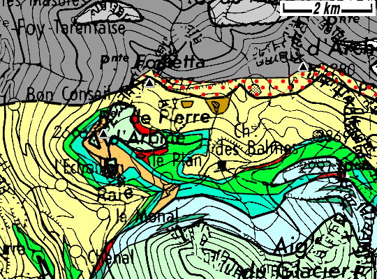 Sur la carte géologique du BRGM cet accident est même interprété comme un tronçon d'une grande "faille de Rhêmes - Chardonnet". Mais en premier lieu il paraît bien peu convaincant d'admettre que son tracé détermine, du côté NE, la vallée de Rhêmes. D'autre part il est difficile d'admettre et qu'elle se poursuit à l'ouest de la vallée de l'Isère (voir la page Franchet) et encore plus qu'elle y délimiterait, au delà, la klippe de schistes lustrés du Chardonnet du côté septentrional (voir la page "Tignes"). |