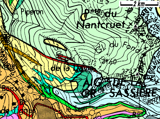 C/ En rive gauche (sud) du vallon de la Sassière les schistes lustrés couvrent une bien moindre surface qu'en rive droite, car ils n'affleurent guère que sur le versant nord de la Pointe de Picheru (ils en couronnent également le sommet en y formant une klippe), et en fond de vallon au niveau de l'appui ouest du lac de la Sassière.