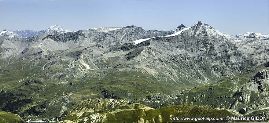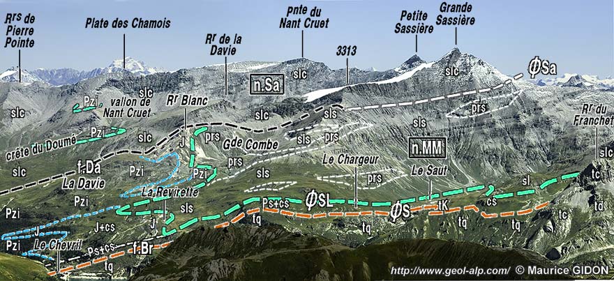 ![]() Le versant sud-occidental de la montagne de la Grande Sassière vu du sommet du téléphérique de la Grande Motte. L'avant plan (montagne de la Tovière), qui appartient à la rive gauche la vallée de l'Isère, a été surchargé d'un voile noir, pour ne pas le confondre avec les pentes de rive droite (pour la partie basse de ces dernières, voir les pages "Chevril" et "Franchet". n.Sa = nappe de la Sassière ; n.MM = nappe de Méan Martin ; ØSL = surface de chevauchement basale des nappes de schistes lustrés ("ligures") ; ØS = chevauchement du Saut (prolongement oriental vraisemblable de celui de La Sache) ; f.Da = faille de la Davie ; f.Br = faille des Brévières. "J" = marbres et brèches du Jurassique ; "Pzi" = gneiss et micaschistes du socle cristallin paléozoïque du massif du Pourri. |
