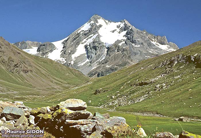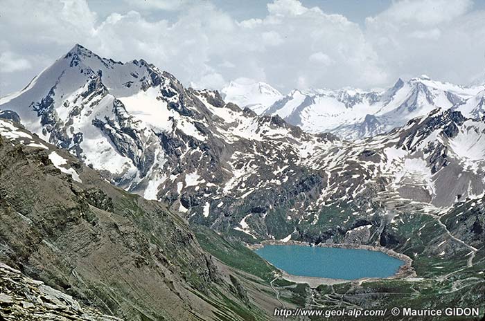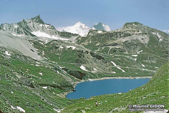La nappe de la Sassière est constituée par un empilement extrêmement monotone de plaquettes calcaires centimétriques à décimétriques. Elle ne montre ici que le rebord méridional d'un pupitre rocheux penté vers le nord-ouest qui est garni côté nord par le glacier de la Sassière. Ses affleurements dessinent au total une klippe quadrangulaire d'environ 5 km de côté, dont le bord septentrional est constitué par l'entaille du cirque des Balmes, en marge sud du vallon du Clou. Du côté oriental il est limité par l'arête frontière du Nancruet qui domine la partie la plus haute du Valgrisanche (où la Dora prend sa source). La nappe de Méan Martin, à matériel plus argileux, héberge les lentilles de "roches vertes" (ici des prasinites) que l'on repère assez facilement dans la face qui domine le vallon de la Sassière. |