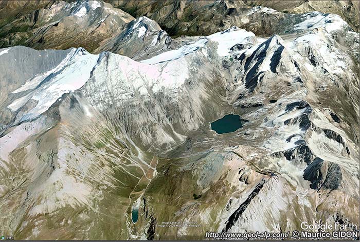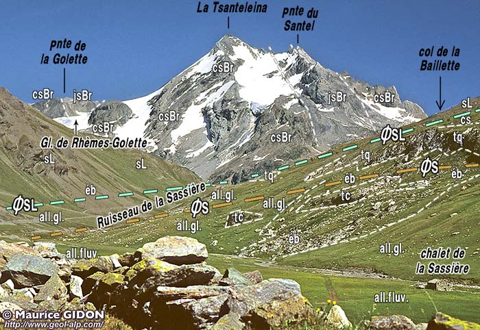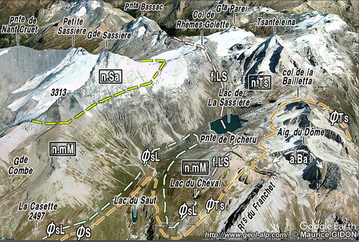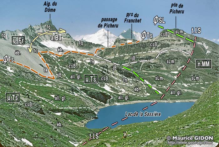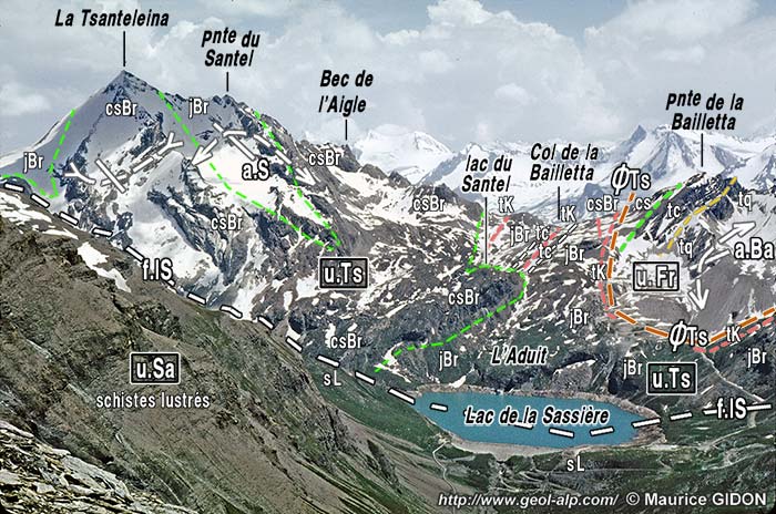D'autre part dans les abrupts occidentaux de cette Pointe de Picheru (voir la page "Franchet") il est bien visible que les schistes lustrés reposent sur des brèches jurassiques et néocrétacées qui sont caractéristiques de l'unité de la Tsanteleina (ces couches en sont les affleurements les plus occidentaux reconnus). Ces couches affleurent en effet en continuité avec celles de cette unité qui garnissent, plus à l'est, les pentes inférieures du versant septentrional du chaînon Dôme - Bailletta (elles plongent là dans le lac de la Sassière, en raison du fait qu'elles appartiennent au flanc septentrional de l'anticlinal de La Bailletta).