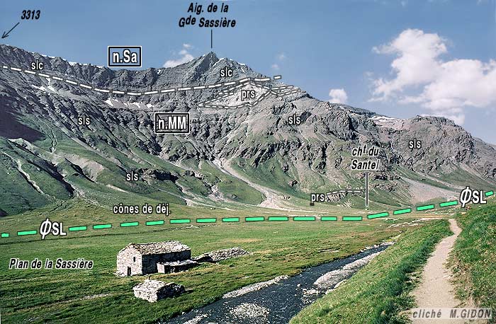 A/ Au nord du débouché du vallon de la Sassière la crête occidentale de la montagne prend, à partir de son épaule 3313, la direction du NW ; de ce fait son versant occidental s'épanouit dans les pentes de La Grande Combe, puis de La Davie, qui descendent en direction du lac du Chevril. La structure de la partie basse de ce versant prolonge celle donnée par la coupe du ravin du Saut en aval du vallon de la Sassière (voir la page "Franchet"). Par contre ses pentes de mi-hauteur montrent des complications supplémentaires qui consistent pour l'essentiel en ce que les surfaces de charriage mises en évidence dans l'entaille E-W du vallon de la Sassière y changent de géométrie : elles s'y prolongent par des cassures sub-verticales en subissant donc une transformation comparable à celles des rapports entre le fond et la paroi latérale d'un tiroir (voir la page "rampes latérales").