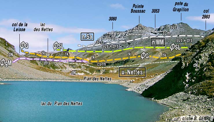 Cette unité des Nettes semble ici venir au jour sous la nappe de la Grande Motte (encore que cela ne soit pas un fait indiscutable). D'autre part ses affleurements se ferment (de façon difficile à préciser) au sud du refuge de la Leisse, de sorte qu'elle semble apparaître en fenêtre*. Ses particularités stratigraphiques et tectoniques conduisent par ailleurs à s'interroger sur ses rapports avec les autres unités briançonnaises ou assimilées (voir la discussion ci-après, en fin de page) |