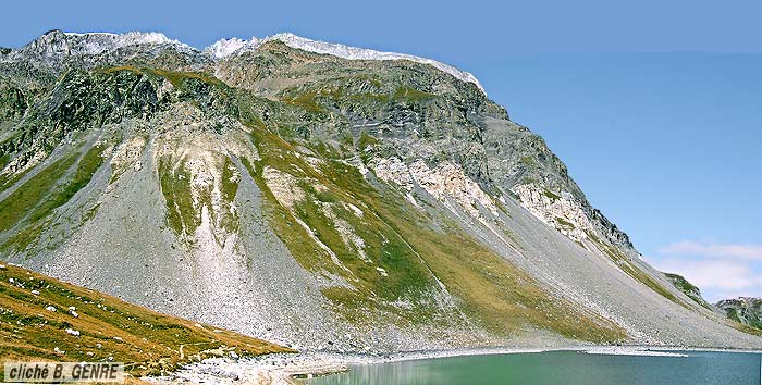 Au sud du lac des Nettes le Lias continue au contraire à affleurer en rive ouest du vallon et son soubassement de dolomies noriennes apparaît même, à l'aplomb du lac artificiel du Plan des Nettes, dans les abrupts inférieurs de la Grande Motte.