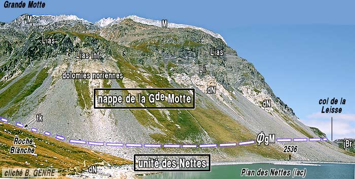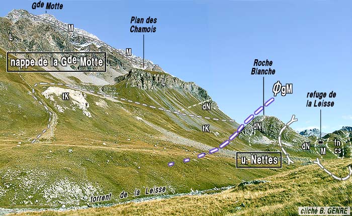 N.B. : La surface présumée du charriage de la nappe de la Grande Motte devrait théoriquement séparer les domaines où le Lias est absent de la série stratigraphique (au sud-ouest du col de la Vanoise) de ceux où il est présent (au nord-est du col de la Vanoise). Mais au nord-ouest du vallon de la Leisse il ne semble pas possible de localiser, entre le socle cristallin et les affleurements liasiques un accident tectonique qui corresponde à une surface de charriage avérée (c'est par contre le cas au "Rocher du col" = Pointe de Pierre Brune). |