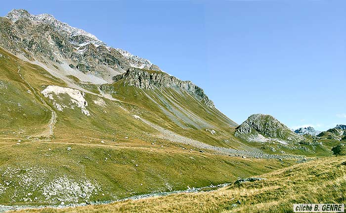 Cette bande gypseuse se rattache indubitablement vers le nord aux affleurements de La Tovière. Elle constitue un coussinet intercalaire sous les unités de schistes lustrés et se prolonge vers le sud jusqu'à se raccorder, dans la même position aux larges affleurements gypseux de la vallée de l'Arc en aval de Termignon : elle se rattache donc clairement à la "nappe des gypses". Mais il est à remarquer que c'est seulement ici, de part et d'autre du col de la Leisse, que le matériel de cette unité repose sur celui de l'unité de la Grande Motte. Ailleurs notamment au bord septentrional des affleurements de ce domaine stratigraphique (à l'ouest comme à l'est du col du Palet) ses gypses et cargneules affleurent très en contrebas nord, ce qui suggère plutôt qu'ils s'engagent en dessous ; il en est de même dans les pentes à l'ouest du Refuge de la Leisse (voir le cliché, plus loin dans cette page). D'autre part en Maurienne (notamment à Bellecombe, au nord de Termignon) ces couches gypsifères affleurent à la base de la succession carbonatée de l'unité de la Dent Parrachée (qui appartient aussi à la "nappe de la Grande Motte") : elles ne reposent pas sur cette nappe mais sur le socle de la Vanoise orientale (ou sur les unités briançonnaises de sa couverture proprement dite). En fait l'enfoncement de la nappe de la Grande Motte sous cette "nappe des gypses" est finalement limité aux abords du col de la Leisse. On peut donc se demander s'il ne résulte pas seulement d'une imbrication secondaire, sans doute liée à la mise en place des nappes ligures et si ce matériel gypsifère ne représente pas les restes du soubassement stratigraphique originel de la succession de la Grande Motte, abandonnés en chemin lors de son refoulement par dessus l'anticlinal de socle de la Vanoise orientale. |