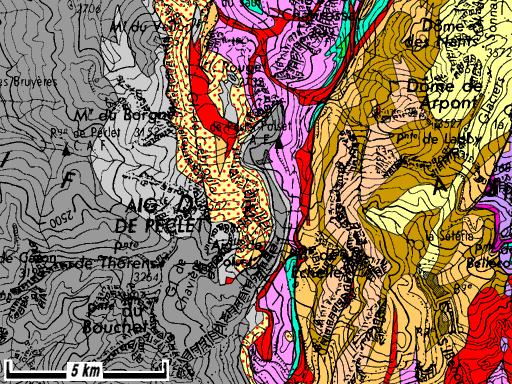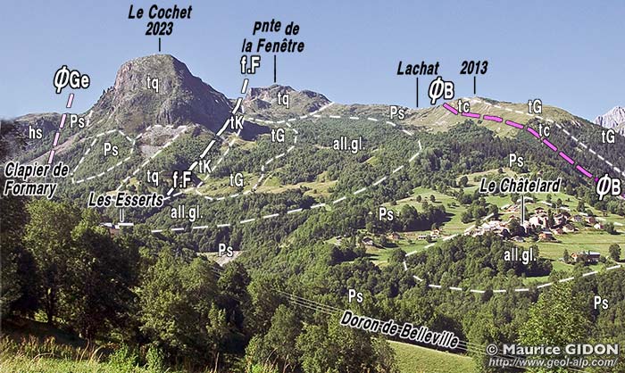 l'extrémité droite donne une interprétation du massif de Péclet qui est complétée abusivement vers le bas par un synclinal dont le flanc inférieur est figuré dans le bas de versant du vallon de Gébroulaz, mais il n'existe pas ... (voir la page "Péclet").
