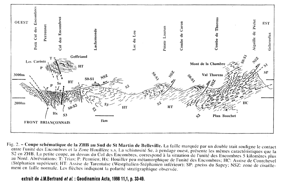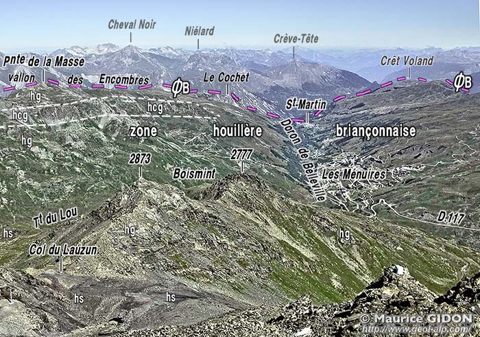 Ces crêtes de rive droite de la Maurienne donnent, entre Saint-Michel et Modane une profonde coupe oblique de la zone houillère briançonnaise (voir la page "Orelle"). Elle ne montre, de haut en bas du versant de cette grande vallée, que des terrains schisto-gréseux ou conglomératiques d'âge houiller ; mais elle montre le changement de l'attitude tectonique de leurs couches, lequel est connu de très longue date sous le nom d'"éventail briançonnais". De fait les plis et chevauchements y sont déversés vers l'ouest au NW d'une ligne (que la vallée de Belleville traverse à angle aigu) passant par Les Ménuires et le Lac du Lou, alors qu'ils sont déversés vers l'est du côté oriental de cette ligne.