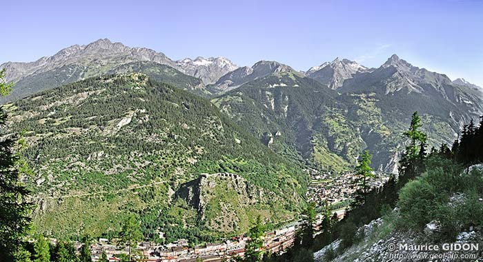 Les pentes septentrionales de la Vallée de l'Arc au nord de Modane, vues depuis La Turra (versant oriental de la crête des Sarrasins). |