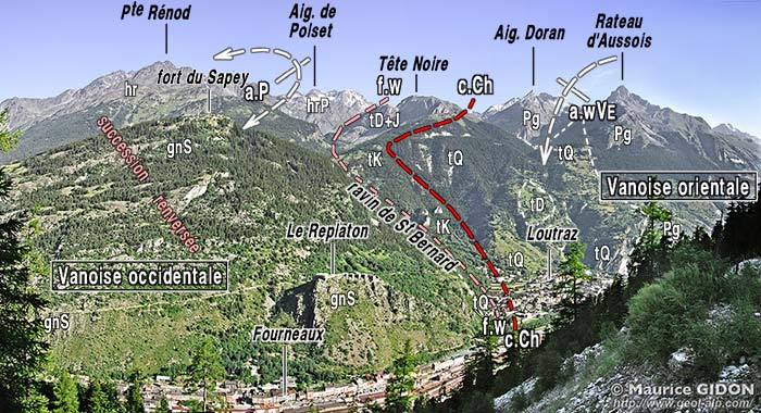 - au nord-est de Loutraz, où aboutit la bande de cargneules de la cicatrice de Chavière, on rentre, dans le domaine de la Vanoise sud-orientale : ce dernier se caractérise au contraire par l'absence de houiller dans son soubassement et par le repos de puissants schistes siliceux permiens sur un socle métamorphique (voir aussi la page "Rateau d'Aussois").