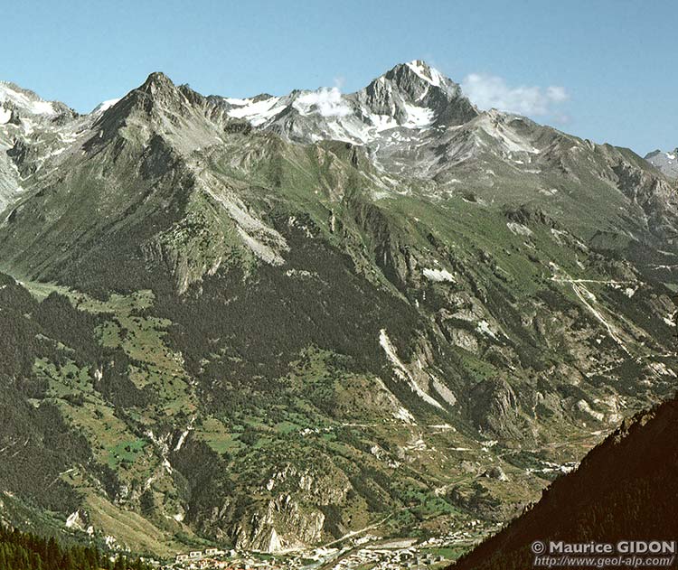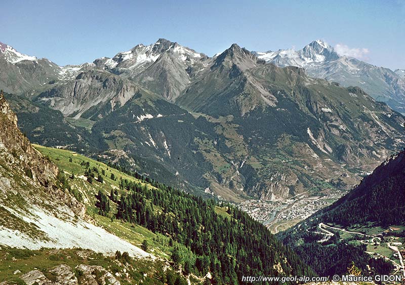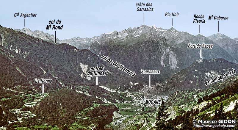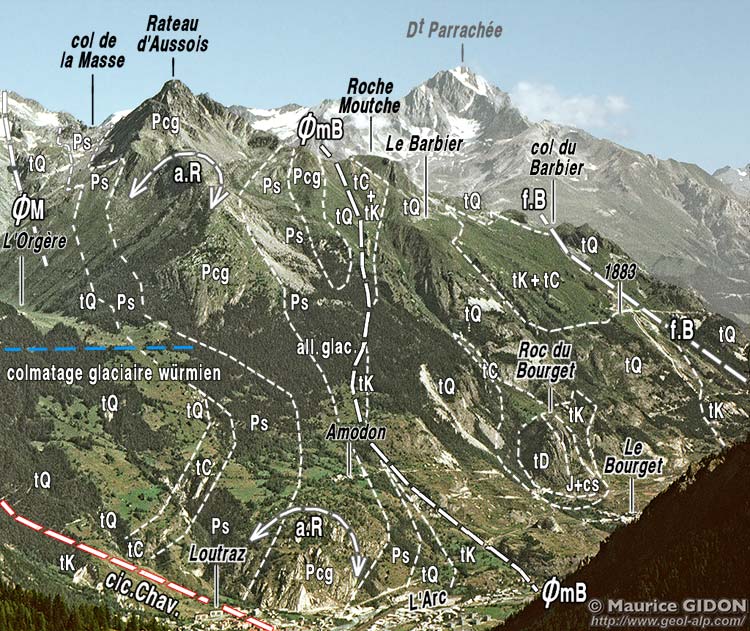 Au niveau de Modane les pentes septentrionales de la vallée de la Maurienne (rive droite de l'Arc) appartiennent à l'extrémité tout-à-fait méridionale du massif de la Vanoise. Elles ne montrent presque que des terrains siliceux d'âge houiller à triasique, lesquels sont répartis, sur les deux rives de l'Arc, en deux ensembles distincts, de part et d'autre d'un accident majeur, à peu près N-S, la cicatrice de Chavière.