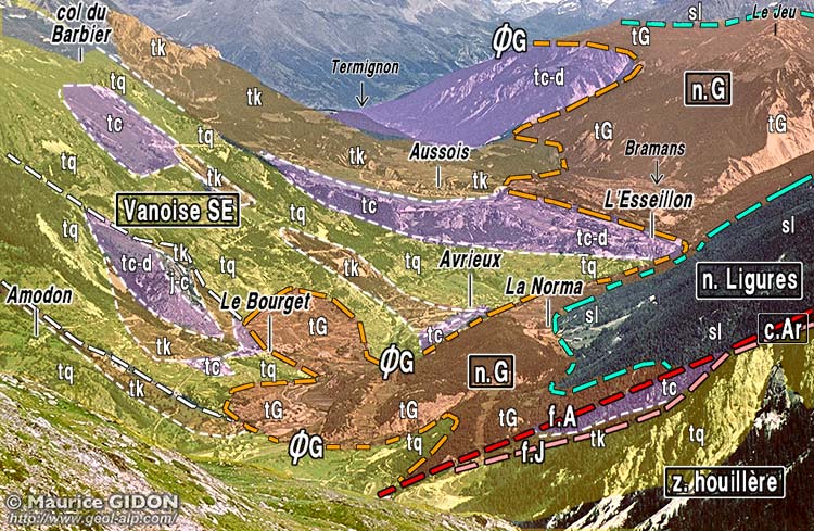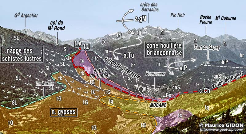 ![]() La vallée de l'Arc en amont de Modane, vue du nord-est depuis les pentes du Barbier, à l'ouest d'Aussois. f.A = faille d'Arrondaz : prolongement de la faille orientale (c.Ch) de la cicatrice de Chavière ; f.J = faille du Jeu (faille occidentale de la cicatrice de Chavière) ; a.P = anticlinal de La Praz ; a.Tu = anticlinal de La Turra, prolongement apparent du précédent ; a.gM = anticlinal de la Grande Montagne, qui reploie les imbrications de la partie orientale de la zone houillère (voir la page "Sarrasins") . " Ps" = Permo-Trias ; "gnS" = gneiss du Sapey ; "h-P" = Permo-Houiller : assise de Courchevel ; "hr" = Houiller moyen : formation de Tarentaise, gréso-pélitique (Westphalien - Stéphanien) ; "hi" = Houiller inférieur (formation de Cristol, gréso-conglomératique, du Namurien). |