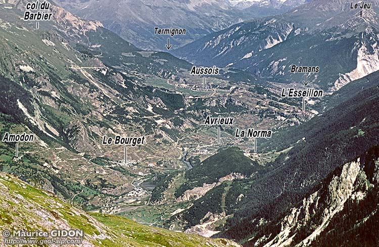 En fait c'est donc pratiquement le tracé de la surface de charriage des nappes de schistes lustrés qui a guidé, en amont de Modane, celui de la vallée de l'Arc. Ceci se comprend d'autant plus aisément qu'il s'y révèle jalonné par de fortes accumulations gypseuses, qui ont dû jouer le rôle de coussinet lubrifiant traîné sous la nappe ; ces dernières affleurent dans les basses pentes de rive gauche qu'elles forment jusqu'à une altitude atteignant aisément 300 m au dessus du lit de la rivière. C'est notamment la limite entre ces amas gypseux et les schistes lustrés des pentes plus élevées qui détermine la selle où s'est implantée, à flanc de vallée, la station de ski de La Norma.