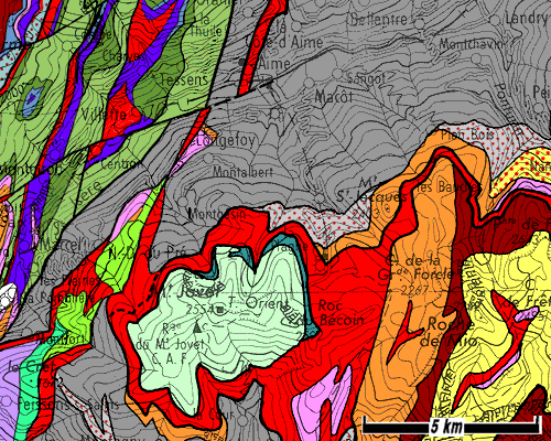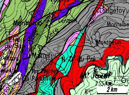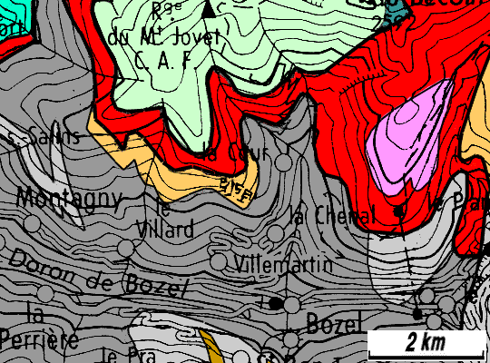 redessinée sur la base de la carte géologique d'ensemble des Alpes occidentales, du Léman à Digne, au 1/250.000°", par M. Gidon (1977), publication n° 074 |