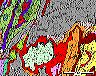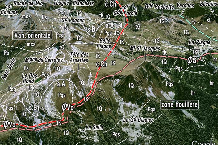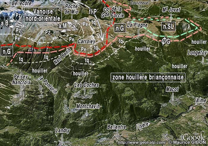 ![]() Les montagnes de rive gauche de l'Isère entre Peisey et La Plagne, vue d'ensemble, du nord. vue pseudo aérienne d'après une image extraite de "google-earth" n.SL = nappe des schistes lustrés (klippe du Mont Jovet) ; n.G = "nappe des gypses" ; fl.P = flexure de La Pontille (bord occidental de la Vanoise nord-orientale (voir la page ""Champagny) ; a.M = anticlinal de Mio ; a.B = anticlinal couché présumé de Bellecôte. "Pz" socle paléozoïque ; "Pe" = Permien" ; "tq" = quartzites triasiques (base de la couverture mésozoïque de la zone houillère). En rouge la faille orientale de la cicatrice de Chavière - Champagny et le chevauchement de la Vanoise orientale. |