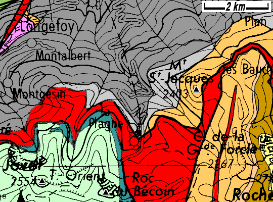 En outre leur épaisseur est accrue par le fait que la bordure occidentale de cette nappe est ployée en un gros anticlinal couché de Mio, déversé vers l'ouest : ce pli est vraisemblablement le prolongement occidental de celui qui est supposé affecter le Paléozoïque des escarpements nord de Bellecôte.