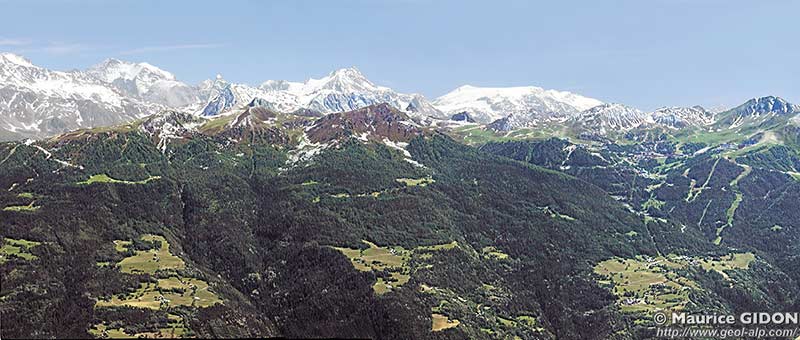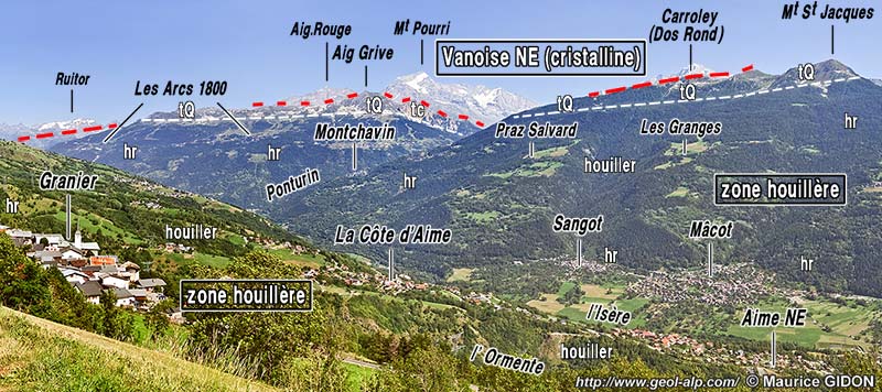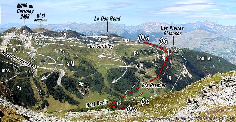 ![]() Les pentes supérieures de la rive gauche de la moyenne Tarentaise en amont de Mâcot, vues du nord, depuis les alpages du Mont Rosset (rive droite de l'Isère). ØsL = surface basale de la nappe des schistes lustrés ; ØG = chevauchement de la nappe des gypses ; c.Ch = cicatrice de Champagny - Chavière ; ØVo = chevauchement de la Vanoise orientale (dans le secteur di Carroley il se raccorde à l'accident ptécédent). hrP = conglomérats permo-houillers ("assise de Courchevel"). suite de ce paysage vers la droite à la page "Mont Jovet" |
