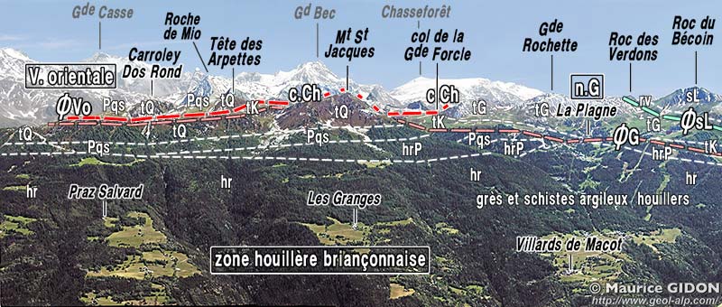 La coupe donnée par le bord supérieur du versant qui tombe sur Mâcot (voir plus haut dans la présente page), montre le raccord à ce chevauchement peu penté, qui recouvre en tangence les couches de la couverture sédimentaire de la zone houillère briançonnaise.