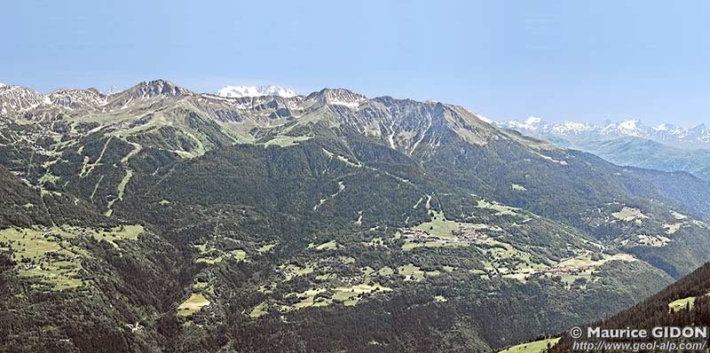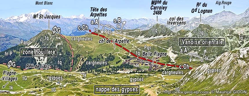 On observe en outre clairement, dans les pentes septentrionales du Dos Rond (cliché précédent) , que ce chevauchement tranche par le bas les replis (sans doute plus anciens) qui affectent la marge occidentale de la Vanoise orientale. Il y apparaît en outre vraisemblable que ce soit lui qui prolonge vers l'ouest, dans le secteur de La Plagne pour y constituer la surface basale de la nappe des Gypses sous la klippe du Mont Jovet.