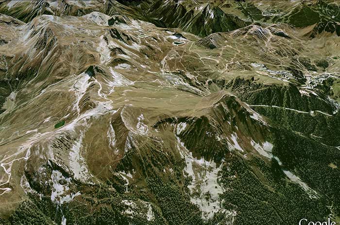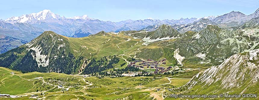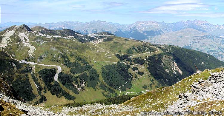 Mais la partie haute du domaine skiable, couronnée par les crêtes de la montagne du Carroley, est constituée par des échines d'alpages dont le relief, plutôt mou est dû à ce qu'il y affleure en prédominance les épais terrains schisto-gréseux du Permien qui sont propres à la nappe de la Vanoise nord-orientale.